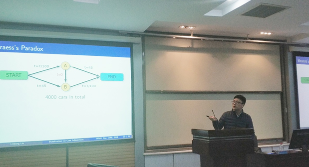 刘林冬副教授首先以合作打车问题为例来介绍合作博弈的背景,并讲解了形成合作联盟形成的两个条件:每个局中人分担成本的和等于总成本、任意局中人组成的子集所分担的成本小于等于该子集单独行动产生的成本,这种分配的集合被称为合作博弈的核。合作联盟的稳定性在核非空时得到保证。而在许多情况下,合作联盟常面临核为空集而变得不稳定,针对此情形,刘林冬副教授及其研究团队针总结了以往研究常用三种解决方法:补贴机制(补贴联盟中参与者)、惩罚机制(惩罚离开联盟的参与者)、补贴+惩罚机制,并用图文并茂的方式解释了其中原理和他们团队的研究结果。