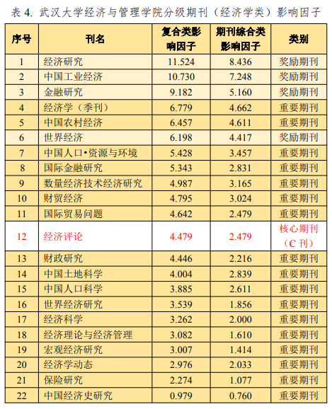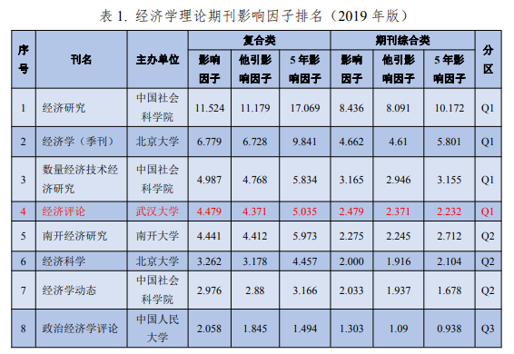 根据2019年公布的统计数据(2018),《经济评论》的复合影响因子和综合影响因子可以在“经济学理论”期刊中排名第4,仅低于《经济研究》《经济学(季刊)》《数量经济技术经济研究》(见表1)。