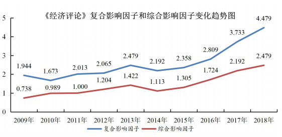 近年来,《经济评论》的学术影响力显著提高,复合影响因子和综合影响因子分别由2009年的1.944和0.738大幅提高到2018年的4.479和2.479。