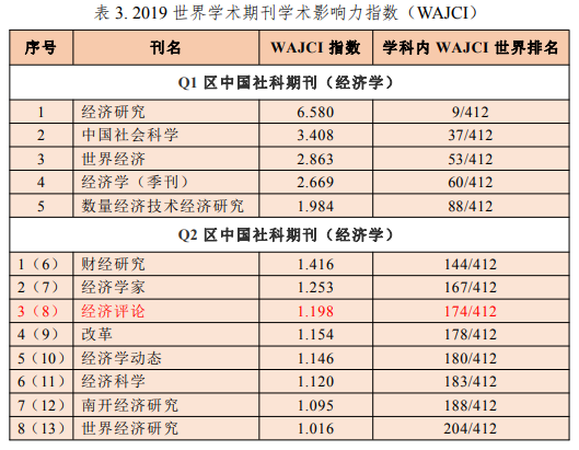 另据《世界学术期刊学术影响力指数(WAJCI)年报(2019)》公布的数据,《经济评论》2019世界学术期刊学术影响力指数(WAJCI)为1.198,学科内WAJCI世界排名174,位居中国经济学社科期刊第8名,Q2区第3名(见表3)。